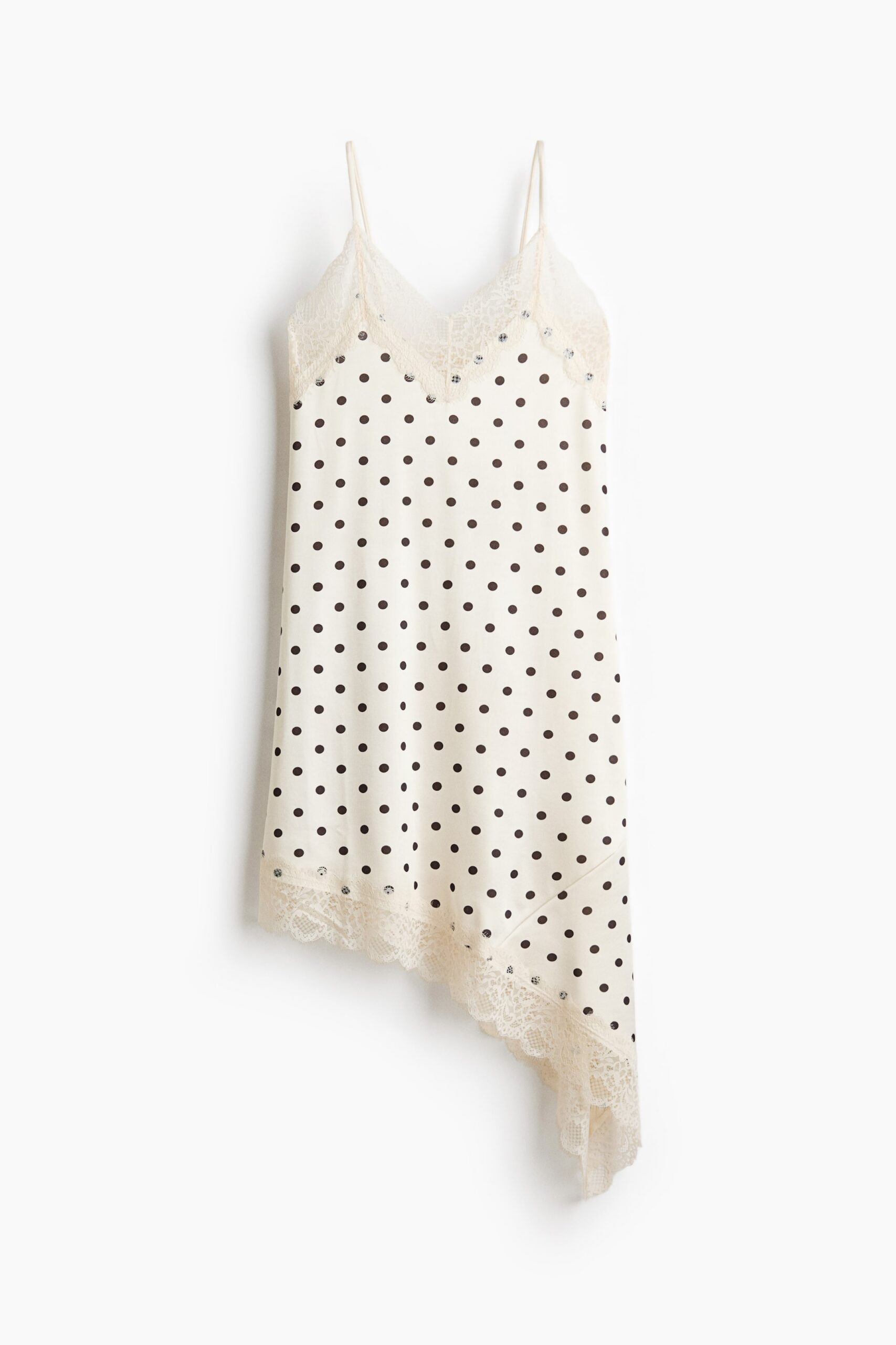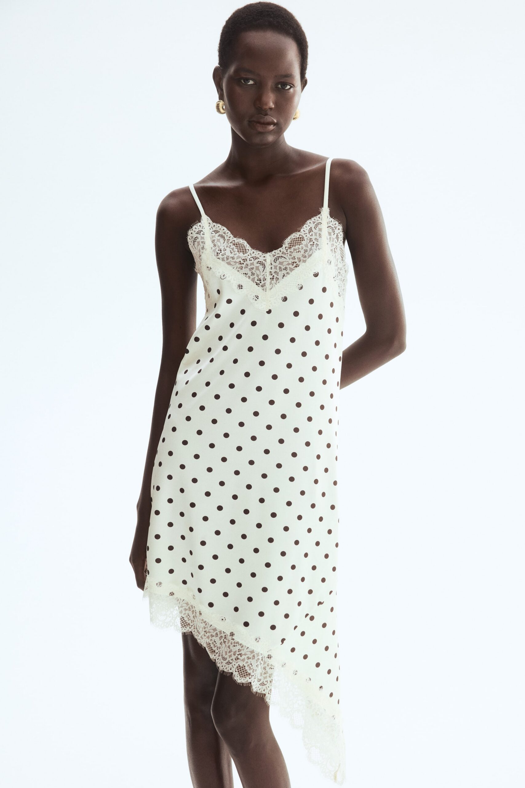 Dżersejowa sukienka do połowy łydki wykończona koronką u góry i u dołu. Wąskie ramiączka, dekolt w serek i asymetryczny brzeg u dołu.
